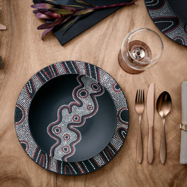 The cutlery in a soft bronze tone perfectly matches the Manufacture porcelain in a rocky black or white. The matte and flattering surface sit